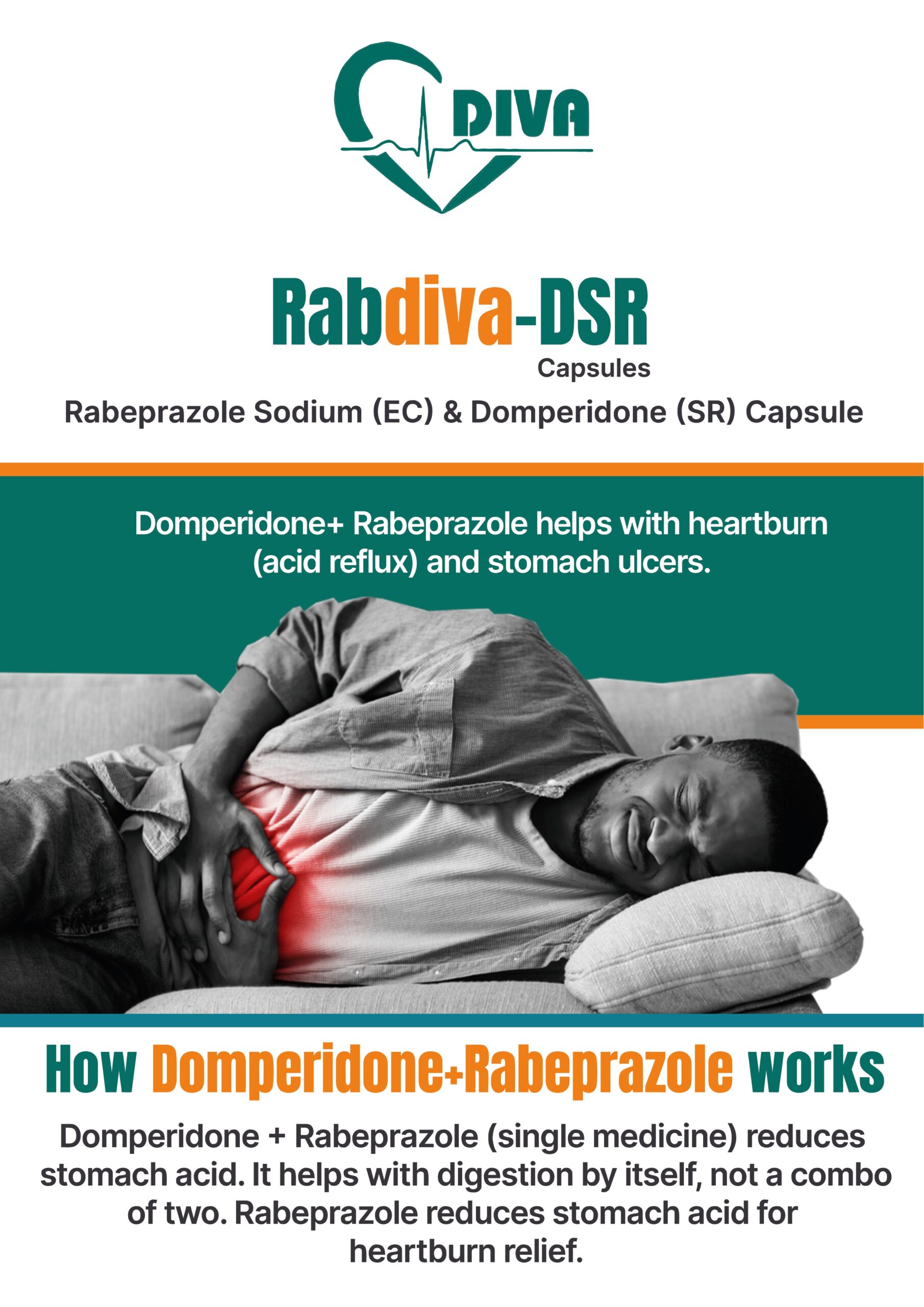 Rabdiva-DSR Capsule is a combination medicine used to treat gastroesophageal reflux disease (Acid reflux). It works by relieving the symptoms of acidity such as heartburn, stomach pain, or irritation. It also neutralizes the acid and promotes easy passage of gas to reduce stomach discomfort.